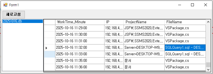 DB파일은 일자별로 1개씩 생성하도록 만들었기에.. 근무한 날짜별로 파일이 만들어진다.